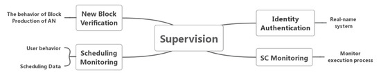 Supervision plays a crucial role in the consortium blockchain-based system. Firstly, the system adopts the access mechanism of identity authentication, and the public key and private key are distributed to each participant—AO, AU and SS by CA. The public key is public and is generated by the organization name of the participant, while the private key is not public, is granted by CA, and is saved by AO, AU and SS, respectively. Additionally, this paper assumes that SS is absolutely credible, thus, the privacy of each AO and AU is known to the SS, which ensures that SS is able to discover which real-life participants are acting maliciously. Besides this, SS has the right to monitor the scheduling process, including the scheduling requests sent and the scheduling process data, but it does not participate in the scheduling and affects the scheduling efficiency. For example, if a certain AU sends an attack request that could cause the system to crash, SS can detect it and then take punitive measures of deduction and credit deduction.