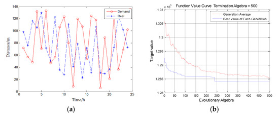 Moreover, to verify the availability, effectiveness, and breakthrough of the proposed method, we conduct the experiments to test the relationship between distance and time in the scheduling process of the system and also test the relationship between the evolution algebra of the objective function and the optimal solution. The experiments adopt Algorithm 1. The experimental results in Figure 12 show the simulation results of the system proposed in this paper.