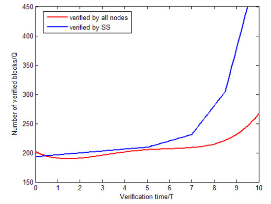 In Figure 13, the abscissa represents the validation time, and the ordinate represents the number of blocks to be validated. The red line represents the conventional consensus efficiency that requires all nodes to validate together, and the blue line represents the efficiency of the system supervisor (SS)-based approach. Obviously, the blue line is basically always above the red line, and the improved verification method is much better than the previous method when the time exceeds about 5T.