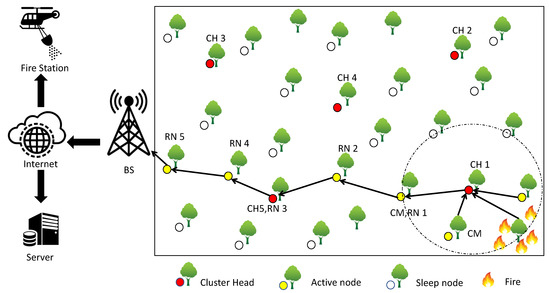 In our protocol, the nodes are scattered homogeneously and randomly with a uniform distribution in a rectangular field (100 m × 200 m). Figure 1 indicates the overall network model, including a description of the uniform random distribution of the nodes in a disaster application such as a forest fire.
