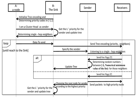 In Figure 3, a fire flag has been set up because the nodes are somehow aware of each other’s status and make a more accurate decision regarding whether to send data to each other on the basis of events. In disaster areas, the fire flag can take two Boolean values of T as a non-uniform event (the disaster state) and F as a uniform event (the normal state). In order to validate paths from the CHs to the sink, nodes (particles) are mapped onto a random-priority number between [−1, 1]. The path construction procedure is shown for each CH in the following the Unified Modeling Language (UML) sequence diagram: