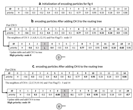 In the following, if the sender node takes a flag value of F when listening to its single-hop neighbors, then the next-hop is chosen based on the highest priorities of the single-hop neighbors. Otherwise, if the sender node takes the flag value of T, then the sender generates random priorities between for the single-hop neighbors (updating encoding particles). In this way, the packets try to pass through more reliable paths. Next, for the next hop chosen, the penalty L (L < −1) is set so that it does not participate in the selection process again. The path formation based on modified tree encoding for each CH (3 and 6) is illustrated in Figure 5.