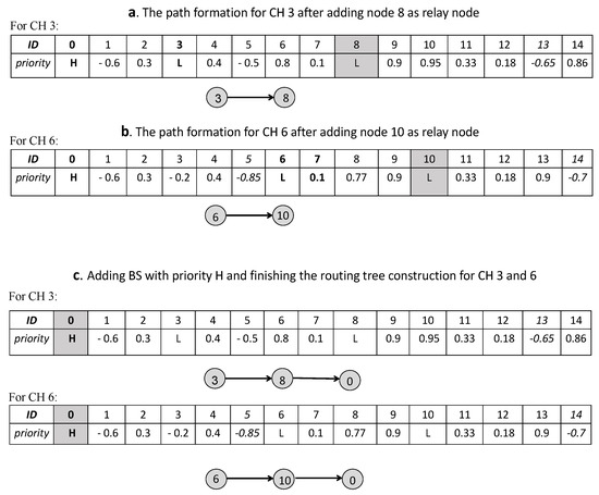 According to Figure 5, we continue the process of modified tree encoding: (a) the path formation for CH 3 after adding node 8 as a relay node (RN); (b) the path formation for CH 6 after adding node 10 as an RN; (c) adding BS with priority H and finishing the routing tree construction for CHs 3 and 6.