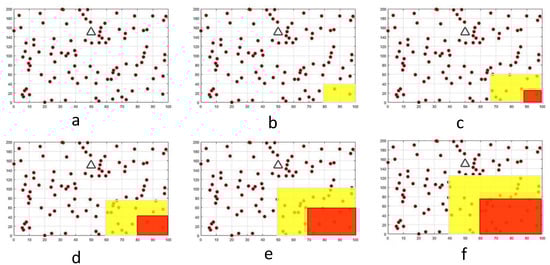 In this work, a forest fire spreads from one direction and expands to the center [47]. To show the validity of the results, in addition to the scenario shown in Figure 7, we performed another simulation (without fire) in Section 4.3. In our random model, the yellow area indicates the non-uniformity of the events and red areas show the burned forest and annihilated nodes. As shown in Figure 7, the forest fire scenario includes different processes: (a) from round 1 to round 6, the simulation shows the normal state of the environment; (b) from round 6 to round 12, there is a non-uniform event such as fire smoke, which is indicated in yellow; (c) from round 12 to round 18, forest fires occur, which are shown in red. Similarly, for the rest of the scenario—(d), (e) and (f)—Figure 7 shows the growth of the forest fire proceeding to rounds 24, 30 and 40 of the simulation, leading to more dead nodes.