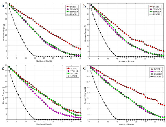The residual energy for sink locations (a) (100, 100), (b) (0, 100), (c) (50, 150), and (d) (50, 200).
