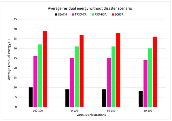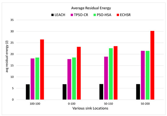 As shown in Figure 8, because of the random selection of CHs, the residual energy of LEACH drops to zero in the early rounds (around 15 rounds). Until 40 rounds of simulation have passed, it can also be seen in Figure 9 that PSO–HSA has a better average residual energy than TPSO-CR because the efficient searching of HS complements the dynamic capacity of PSO and also improves the balance between exploration and exploitation. In other words, the proposed method has better energy dissipation distributions than other methods. Additionally, the proposed method is improved in terms of the overall residual energy by about 1.04–1.42 times compared to PSO–HSA, by about 1.24–1.46 times compared to TPSO-CR and by about 1.70–1.77 times compared to LEACH for the different sink locations according to Figure 8. The reasons for this improvement are the optimum improvement of the structure of PSO–HSA and the attention paid to non-uniform events in the routing phase.