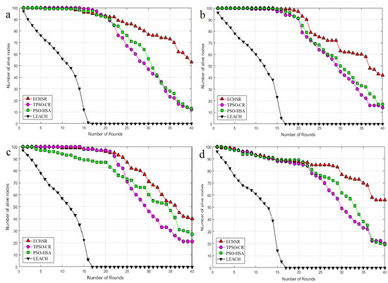 The number of live nodes for sink locations (a) (100, 100), (b) (0, 100), (c) (50, 150), and (d) (50, 200).