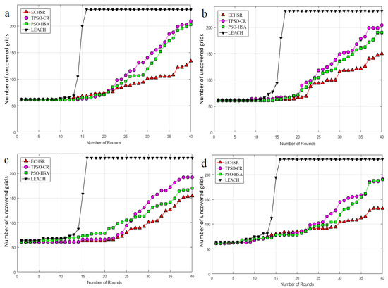 As can be seen in Figure 12, inspired by Figure 11, the proposed method outperforms PSO–HSA by about 1.08–1.32 times and TPSO-CR by about 1.18–1.34 times for the different sink locations. It is observed that the LEACH algorithm in round 16 has a network coverage of zero, which is much lower than the other methods. In general, the numerical results in Figure 12 demonstrate that the proposed method can cover the number of non-CHs more efficiently than PSO–HSA and TPSO-CR.