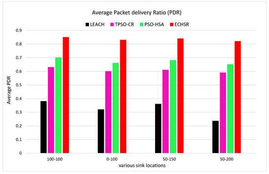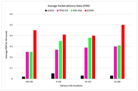 As shown in Figure 13, considering that the worst link quality is removed by the fitness function (Equation (8)) and also that its routing tree is based on modified priority encoding, the proposed method has a higher average packet delivery ratio than other methods in 40 rounds of simulation. Furthermore, the numerical result demonstrates that PDR is increased in our method by about 1.07 to 1.38 times compared to PSO–HSA and by about 1.27 to 1.39 times compared to TPSO-CR for the different sink locations. It is clearly exhibited that LEACH has the lowest average PDR.