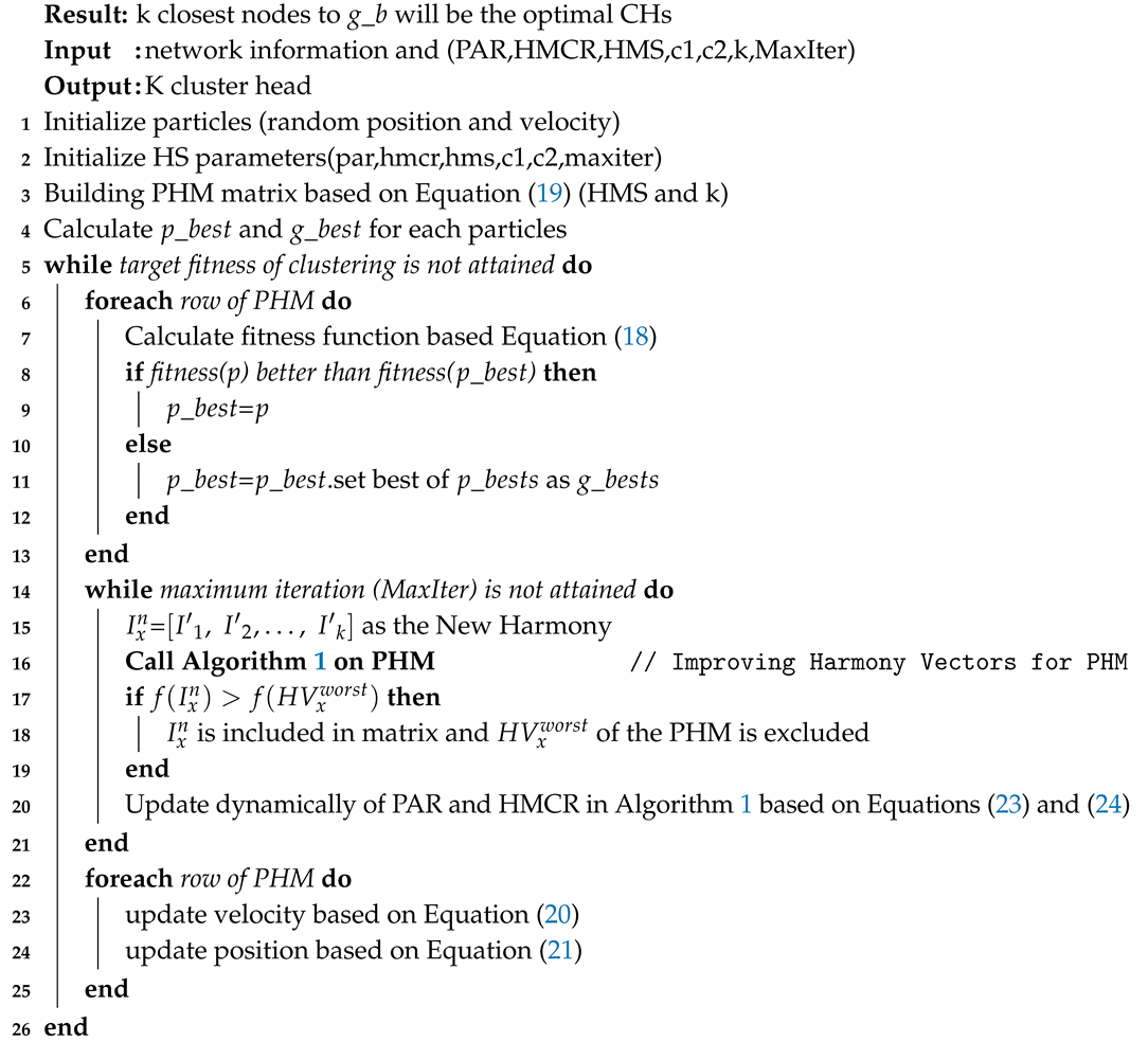 where Nd1 and Nd2 are normal distribution functions with (), ri1 and ri2 are random integers between [1, HMS], ri3, ri4 and ri5 are random mutually exclusive integers between [1, HMS], the function is a uniform random number in [0, 1], and parameter k is generated uniformly by a discreet random number in [1, K] [31]. After method 1 in Algorithm 1, if ≤ PAR, the harmony vector (HV) should be tuned or pitched (a term in music) according to the PAR. is defined as the closest node with more energy than current CH is the cluster. It is necessary to clarify that parameter best in update 2 as the index of the best HV inspired by the GHS method [45]. Next, updating the PHM is the last step in the HS algorithm [29]. To do this, if the fitness function of the new harmony vector () is better than the value of the fitness function of the worst harmony vector in PHM (), the new harmony is included in the matrix and the current worst harmony of the PHM is excluded. Thus, the PHM is updated with this condition, and this step is stopped If the iteration of HSA is bigger than the maximum iteration.Algorithm 1: Pseudo code of Improving Harmony Vectors for PHM - Updating the Location and Velocity of the ParticlesIn this step, to reach the optimal location of the CHs, the PSO algorithm updates the location and velocity of the particles [2]. The best particle location () is determined by the minimum cost of the fitness function in a swarm particle [29]. The , as the global best location, is determined by selecting the best solution of . In this paper, the nodes that harmonize with are taken, and the closest nodes to these harmonies form CHs. The velocity (V) and location (X) of the particles can be updated as follows [23,29]:where the index denotes the xth particles and dimension, and are acceleration constants, and are the random uniform amount in [0, 1], and factor is the inertia weight factor. Selecting a suitable value of creates a balance between exploration and exploitation [46]. In [29], the linear reduction of factor has a positive effect on the efficiency of the application of WSNs, while in [46], the authors proposed a nonlinear time-varying inertia weight formula that led to a faster convergence than the linear inertia factor used in [29,45]. Therefore, to enhance efficacy, we use the following high-order (∝) nonlinear formula:where iter is the current of iteration and is the total number of iterations. Equation (22) [46] decreases nonlinearly from to and finds a suitable value at each round. The obtained results of [46] show that excellent performance is achieved when and the two constants and —as cognitive and social parameters—have the value 2. The location and velocity of the particles are calculated and updated at each round of the proposed method and for each row in PHM. As mentioned above, the closest nodes to will be the optimal CHs.