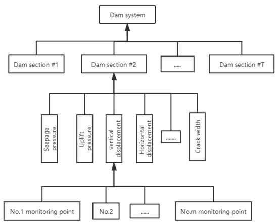 There are many factors influencing the safety of a dam in the dam safety assessment, including deformation and cracks of the dam body, seepage of the dam foundation, etc. [7]. The dam safety is related to the security of each dam section shown in Figure 1. Every part can serve as a subsystem of the whole system. Every subsystem has several monitoring items (like vertical displacement, seepage pressure, and crack width). There are many monitoring points for a monitoring item. For example, there are several monitoring sensors installed in the dam to monitor vertical displacements. Therefore, a lot of quantity information with certainty and fuzzy information with uncertainty can be collected from dam monitoring activities.