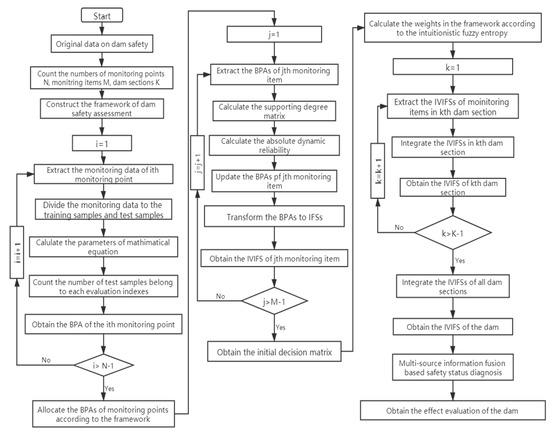The rest of the paper is organized as follows: Section 2.1 presents a brief description of the framework of the multisource model and risk assessment system. The interval-valued intuitionistic fuzzy set, the dynamic reliability, and the Dempster-Shafer evidence theory are introduced in Section 2.2 and Section 2.3. Section 2.4 describes the solving process of the dam safety assessment model. The description of a case study is presented in Section 3.1. The fusion process of the dam risk assessment and the comparison among other model are discussed in Section 3.2, Section 3.3 and Section 3.4. The fusion results of the multiple-arch dam before and after reinforcement are presented in Section 4. Finally, the conclusions and research plan for the future work are given in Section 5.