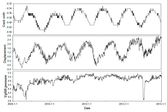 Five evaluation indexes represent five safety states from trend performance of monitoring data. The dam remains normal if the measurements of monitoring points can be forecasted accurately in trend performance. In the analysis of trend performance, the mathematical relationships between monitoring items and their factors such as water levels, temperatures, and time-varying effects should be determined first [15]. The mathematical relationship of monitoring item can be described as the following equation: