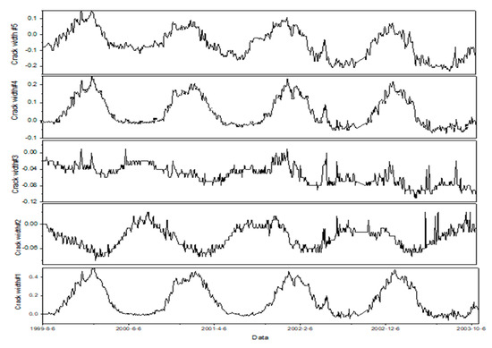 Table 7 indicates that the distances are changing as the time goes by. To illustrate the variation of dam safety, the width crack of dam section #12 is taken for example. Figure 9 shows the variation of crack width for five monitoring points. The width crack remains at lower value area and the dam become safer at the second time period in Figure 10. From the Table 7, the distance between the ideal solution of V1 becomes closer and the distance between that of V3 becomes further at the second time period. Then the crack width remains at a higher value level and there exist peaks at the third time period. Therefore, the distances between the positive ideal solution of ~ become further. It indicates the dam behavior is changing to the fourth evaluation index at the third time period. From the analysis above, the distances between IVIFS and positive ideal solutions can describe the variation of dam safety.