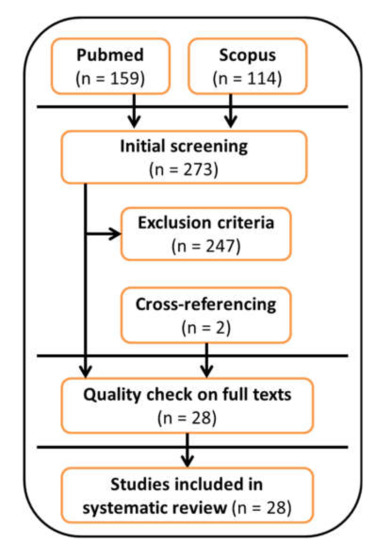 A flowchart of the systematic review process is reported in Figure 1. A total of 273 articles were included in the initial screening. A total of 232 articles were excluded after applying the exclusion criteria because they: (i) did not use a wearable inertial sensor during the 6MWT (168 papers); (ii) were an abstract and/or were conference proceedings (15 papers); (iii) were a review article or a case study (12 papers); (iv) were a study protocol (10 papers); (v) were not written in English (3 papers); (vi) were not ranked on Thomson Reuters (4 papers); or (vii) were published before 2010 (20 papers). In addition, 15 papers were excluded because they were out-of-topic, and two papers were included after cross-referencing. The remaining 28 articles were reviewed in full-text form and were all included in the systematic review after quality assessment.