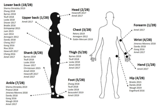 The relative majority of the papers (13/28, 46.4%) reported the use of a single sensor. Of the remaining 15 papers, 2 papers (7.1%) reported the use of 2 sensors, 4 papers (14.3%) reported 3 sensors, 2 papers (7.1%) reported 4 sensors, 1 paper (3.6%) reported 5 sensors, 2 papers (7.1%) reported 6 sensors, 3 papers reported 7 sensors (10.7%) and 1 paper (3.6%) reported the use of 17 sensors. Overall, the majority of the studies (64.3%, 18/28 papers) reported placing at least one wearable sensor on the lower back, with the preferred locations being at the level of the lower back (L3, L5 and the sacrum). Shanks and ankles were also frequent locations chosen by researchers, with 8 (28.6%) and 7 (25.0%) papers, respectively. Further details on the placement of the wearable sensors used in the included articles are summarized in Figure 2.