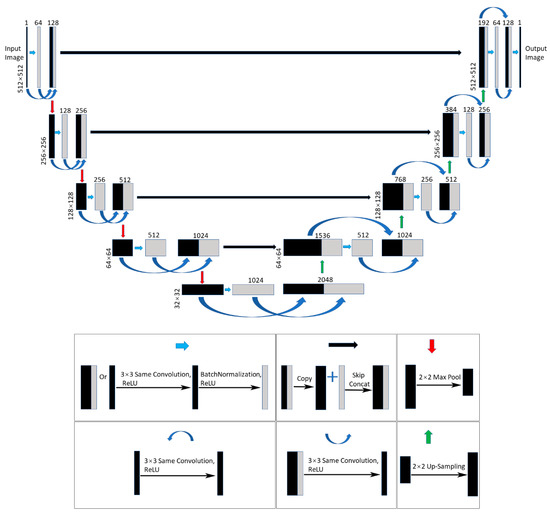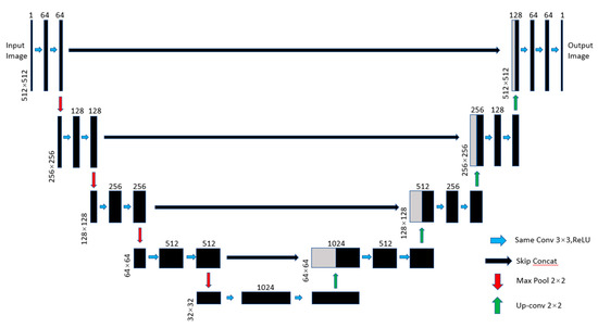 Figure 3 shows the architecture of U-Net. The left part of U-Net is a down-sampling process, which is divided into four groups of convolution operations (blue arrow). In each group of down-sampling operation, first performed is the same convolution with a 3 × 3 kernel size, followed by the BatchNormalization operation, and ReLU activation. After each group of convolution operation, there is a max-pooling layer operation (red arrows), the image size will be reduced to 1/2 of the previous step. The input image of 512 × 512 × 1 size was calculated to be 32 × 32 × 1024 size through four groups of operations. The right part shows the up-sampling process. This process included four steps of deconvolution (green arrows). Each deconvolution step expands the image to twice the size of the image in the previous step. Then, the feature image of the corresponding layer is copied and then concatenated to the result of the deconvolution (black arrows).