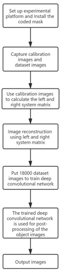 The overall process of image reconstruction and post-processing using a deep convolutional network. As is shown in the figure above, firstly, we used the calibration images measured by the sensor to calculate the left and right system transfer matrix iteratively, and then reconstruct the dataset images and the object images. Next, the dataset images were sent into the deep convolutional network for training, then the trained network was used to post-process the object image, then output the resulting image.