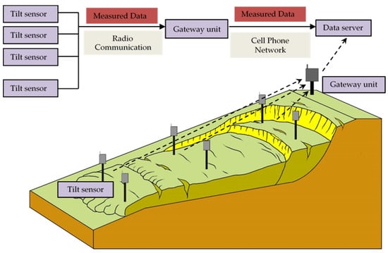 In recent years, with the development of microelectronic techniques, early warning systems utilizing MEMS (microelectromechanical systems) technology have been proposed to monitor and estimate the risk of slope failure [28,29,30,31,32,33,34,35,36,37,38,39,40,41,42,43]. Compared to conventional instruments used to monitor landslides, MEMS sensors, such as accelerometer sensors [30,31,32] and tilt sensors [33,34,35,36,37,38,39], are small, inexpensive and sophisticated, which also greatly reduces the cost of building early warning systems. The low-power radio communication and modular design make the installation and maintenance of the whole system more convenient than cable-connected devices, and the data transmission is more efficient. De Dios et al. [33] and Marciano Jr [34] proposed a landslide monitoring system composed of a “sensor column” buried vertically underground in a borehole. The sensor column consists of pipe segments, each containing triaxial accelerometers for measuring tilt and capacitive sensors for water content measurements. Measurements of the internal deformation taken in each segment are accessed via a controller area network (CAN) communications protocol. However, the tilt meter in the borehole is not convenient to install owing to the requirement of a borehole.