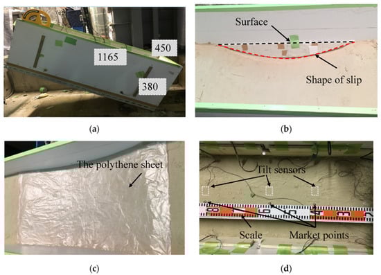 Images of the laboratory test steps. (a) The dimensions of the container; (b) the creation of the slip surface; (c) the polyethylene sheet; and (d) the built surface layer and the installed instruments.