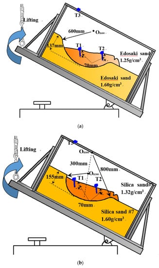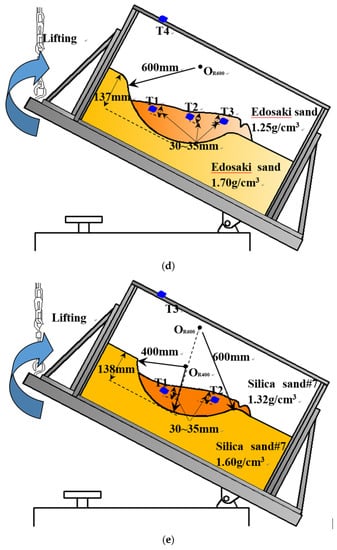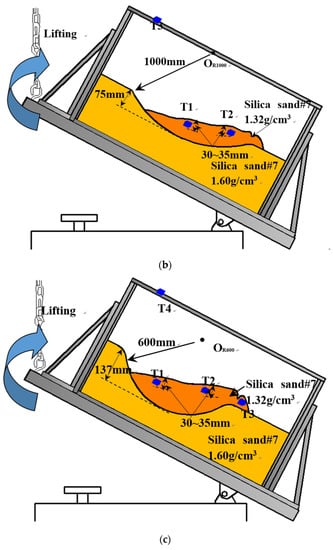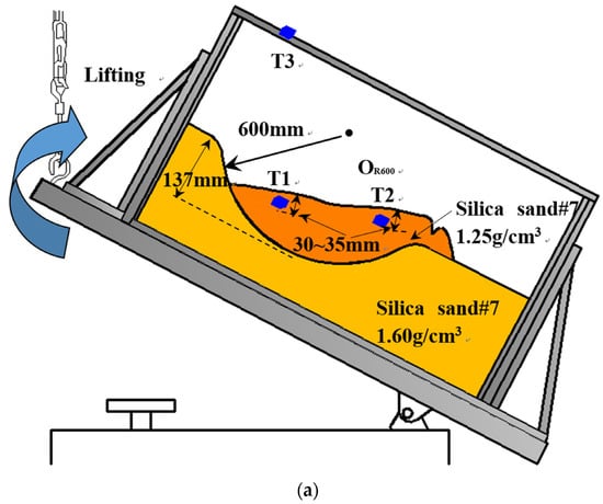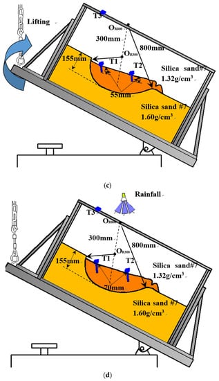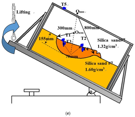 All of the details of the model test mentioned above are shown in Figure 3, and the type of sands and their relative densities, the radii of the predefined slip surfaces and the landslide-triggering factors designed for each model test are introduced in detail in Table 1, Table 2 and Table 3.