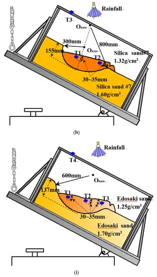 Model tests using tilt sensors with short rods installed above the predefined slip surface were conducted to investigate the tilting direction of the tilt sensors installed on slopes. The details about the geometries of the predefined slip surfaces, the materials used in the model tests and their densities and landslide-triggering factors are listed in Table 2. The schematic illustration for the cross sections of the slope models and the arrangements of the apparatuses employed in these tests are presented in Figure 5.
