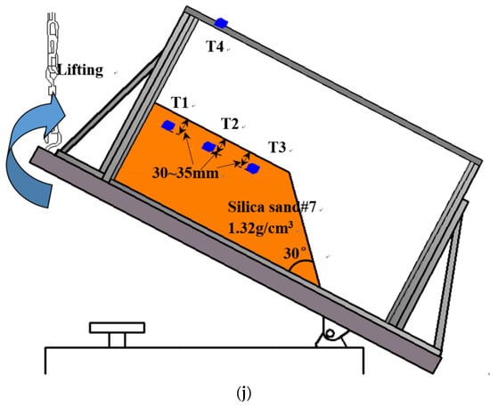 The specific testing conditions, including the geometries of the predefined slip surfaces, the materials used in the model tests and their densities and landslide-triggering factors, are listed in Table 1. The schematic illustration of the cross sections of the slope models and the arrangements of the apparatuses employed in these tests are presented in Figure 4. As shown in Figure 4, tilt sensors were installed on the slope, and an external tilt sensor was attached to the container. As illustrated in Table 1, in Tests 1–7 and Test 10, slope sliding was triggered by inclining the wooden container step-by-step, while artificial rainfall was applied in Test 8 and Test 9 to induce sliding.