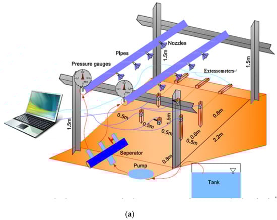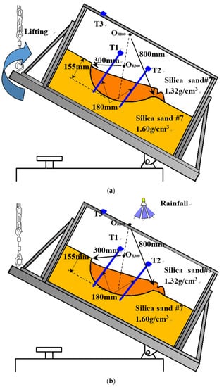 Two model tests were designed to investigate the tilting behaviors of sensors with long rods when landslides are triggered by changes in the stress field through lifting the model test box and changes in the water content induced by simulated rainfall. The geometry of the predefined slip surface and details of the materials used in these tests, as well as the landslide-triggering factors, are listed in Table 3. The schematic illustration for the cross sections of the slope models and the arrangements of the apparatuses employed in these tests are presented in Figure 6.