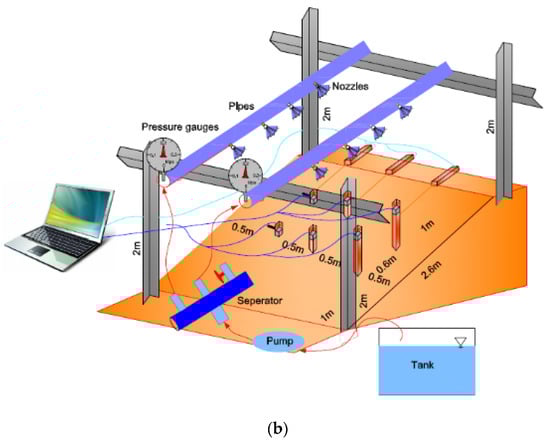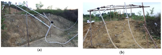 The site for the field tests, which consists of weak expansive soil and some plant roots, is located in Guangxi Province, and the slope angle is 43 degrees. Trenches were excavated both at the toe and the crest of this slope to a depth of 0.4 m. Rainfall was supplied by an artificial rainfall supply system consisting of a pump, artificial pond, water separator and nozzles. In Field Test 1, the rainfall intensity was set to 40 mm/min. Tilt sensors with different lengths of rods, 50 mm, 300 mm and 800 mm, were installed on the slope. The arrangement of the sensors and geometries of the slopes are shown in Figure 7a and Figure 8a. The rainfall intensity in Field Test 2 was 21 mm/h, lower than that in Field Test 1. There were two types of rods with different lengths in Field Test 2, 30 mm and 300 mm. The arrangement of the sensors and geometry of the slope are different in Field Test 2, as shown in Figure 7b and Figure 8b.