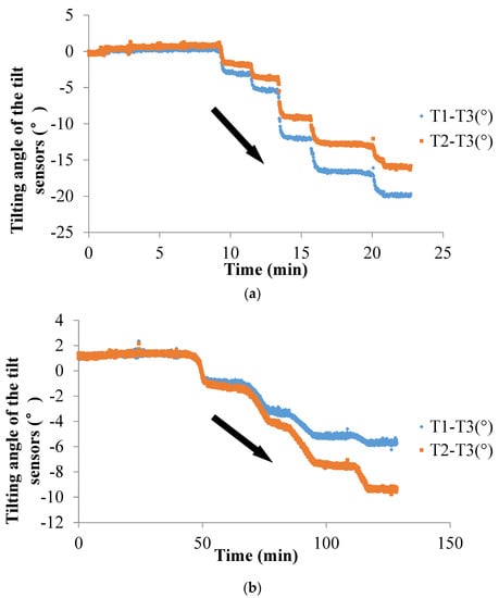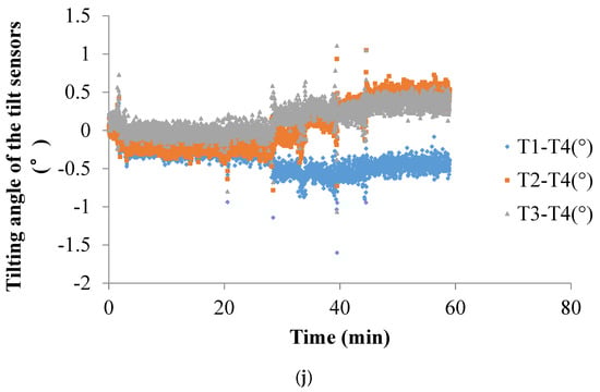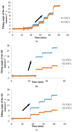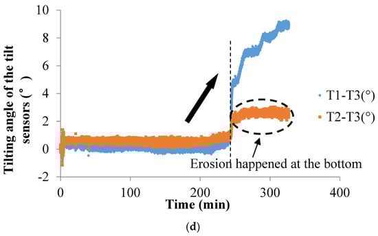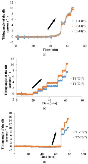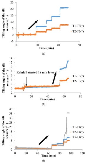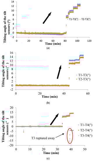 The landslides in Tests 1−8 were caused by inclining the wooden container step-by-step, and the landslip in Tests 9 and 10 was caused by artificial rainfall. The difference between the data obtained from the tilt sensor installed in the surface layer and that from the external tilt sensor attached to the edge of the container represents the tilting angle induced by slope sliding, as shown in Figure 9. As illustrated in Figure 9, the tilt sensors without rods show the same rotation trend as the landslide mass regardless of the varying test conditions. To a certain extent, the behavior of the tilt sensor without rods represents the behavior of the soil in a landslide mass because the tilt sensors are embedded in the soil and small enough to ignore their effect on the soil properties. However, there exists an exception in Test 3, as shown in Figure 9c. The tilt sensor marked as T3 shows an abnormal tilting behavior compared to the other tilt sensors because of the slope rupture at the bottom part of the slope model caused the uncertainty behavior of the tilt sensor, as shown in Figure 4c. Thus, the data from the tilt sensor T3 dropped suddenly. As illustrated in the data collected, the tilting angle of the sensors shows an abrupt increasing trend as the landslide developed, and the position of the tilt sensors and the landslide-triggering factors do not affect the trend in the change in tilting angle obtained by the tilt sensors.