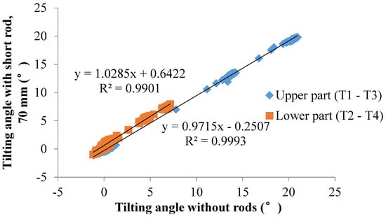 The relationship between the tilt angle measured by sensors without rods and sensors with short rods in Test 15.