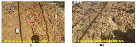 Images of the testing area before and after slope failure: (a) the testing area after failure in Field Test 1; (b) the testing area after failure in Field Test 2.