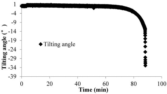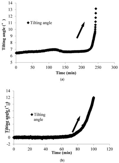 The data of the temporal history of the tilting angle obtained by the tilt sensors in Tests 11–15 are plotted in Figure 10. As Figure 10 illustrates, the tilt sensors with the short rods show the same rotation trend as the landslide masses, which was not affected by the trigger factor, radius of the slip surface, relative density or type of soil. This tilting behavior of the tilt sensors with the short rods is the same as that of the tilt sensors without the rods mentioned above, and the tilting angle of the sensors also shows an abrupt increasing trend as the landslide developed. The position of the tilt sensors and the landslide-triggering factors also do not affect the trend in the change in the tilting angle obtained by the tilt sensors, as shown in the temporal history of the slope-tilting experiments.