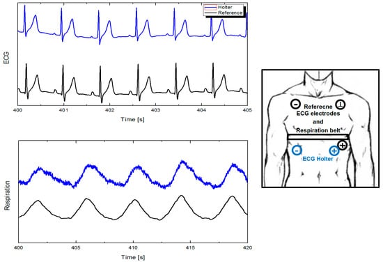 In Figure 2, we performed a short validation measurement where we compared our ECG Holter with a laboratory instrument. The aim was to verify the detailed parameters of the used Holter, including how the signal is affected when different electrode placing is used, if commercially used automated software correctly evaluates our output signals, and, of course, the progress in the process of hospital certification. We were also interested in the overall behavior and reliability of the innovative impedance respiration sensing [54], how it will stand compared to indirect measurement through pressure sensors, and the resistance of the circuit rib cage - chest belts [55,56,57] in different life situations. The ECG Holter signal was post-processed using a digital band-pass filter in range of 1–100 Hz with an auto-adjustable transition width. The respiration was filtered using the same filter in the range of 0.05–3 Hz. We observed that the results were comparable, and even in some situations such as low physical load or conversation, the impedance monitoring performed better. This can also be supported by the fact that the respiration impedance sensing technique has started to be widely used today [58,59,60].