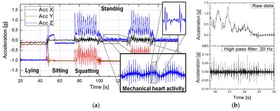 Figure 3a shows an example of signals obtained using our Holter with its IMU fixed to the thorax [68]. Except the overall movement and position of a human, a detailed look of the heart and respiration activity (mechanical heart activity) can be captured. Using a simple 20 Hz high-pass filtering, HR can be obtained even during demanding exercise when the ECG signal is unreadable due to heart bouncing (Figure 3b). Detailed accelerometer signals can be used, e.g., for cough and swallow analysis [82].