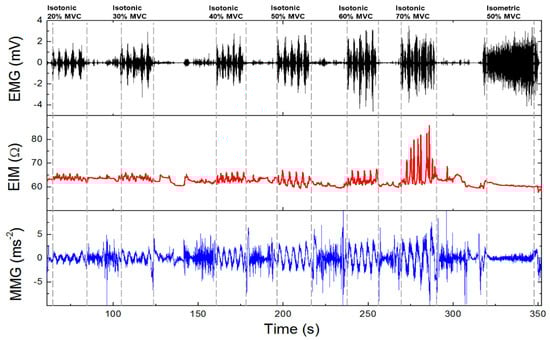 Electromyography (EMG)/electrical impedance myography (EIM)/mechanomyography (MMG) signal of one volunteer.