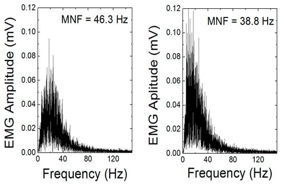 Power signal density. Amplitude and mean frequency mean frequency (MNF) shift of power signal density (PSD) due to fatigue.
