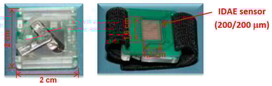 We tried to avoid these problems by constructing an EDA Holter in the form of a practical ring [124] (Figure 8), which does not sense the EDA between the fingers like a conventional device, but locally on a small place in an area of 1 × 1 cm (Figure 9a). Such an EDA ring is more suitable for daily wear and the signal artifacts are lower. The Holter generator generates a sinus signal with an amplitude of 1.6–3 V and frequency of 1 kHz to a gold-plated interdigitated array of electrodes (IDAE). Their size is 200/200 m, so the electric field enters only into the neuroactive areas (stratum lucidum–potential barrier) and the impedance changes are quicker and more bound to the psychogalvanic response. Total dimensions of the EDA Holter are 20 × 20 × 5 mm and the device is connected to a smartphone with Bluetooth 2.0. The data are stored in CSV format. To minimize polarization effects in the skin, also called electrodermal phenomena, we used software filtering of this drift based on periodical recalibration with an exponential function. An exponential approximation was performed every minute, and this exponential was subtracted from the measured data (Figure 9b). This experiment also led to a very important result: The microelectrode probes are able to monitor the electrodermal response, as well as the heart pulses, simultaneously. They are present as small variations in the EDA signal related to blood pulsating in the bloodstream–plethysmography.