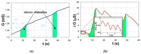 Typical time responses of EDA: (a) Original signal, (b) filtered signal with visible heart-pulses.
