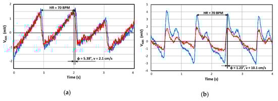 However, returning back to our device that uses only an optical PPG principle, it has to be clarified why it is relevant to continue in this sensing principle. Our main goal is to synchronize ECG Holters on the chest with a smart watch enhanced by our double PPG sensor. Thanks to this concept, we will obtain not only the overall blood speed but also the local speed and, using the appropriate algorithm, we can suppress artifacts like vascular elasticity, hydration, drug effects, etc. and increase accuracy. Figure 11 shows a part of our results, where we see shifted PPG signals (output signals of photodiode, only RED diode active) from the middle finger and wrist, which corresponds to blood speeds of 2.1 and 10.1 cm/s. The heart rate was about 70 BPM in both cases.