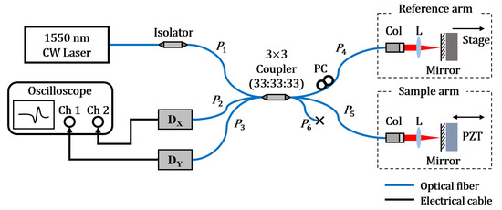 The Michelson interferometer based on a 3 × 3 fiber-optic coupler (R315009004153, Flyin Optronics Co., Ltd., Shenzhen, China) was constructed as shown in Figure 3. A polarized and stabilized 1550 nm laser (SFL1550P, Thorlabs. Inc., Newton, NJ, USA) was used as the light source. The visibility of the interference signal was maximized by adjusting the polarization controller in the reference arm, which was thought for the beams in both arms to give the same polarization states.