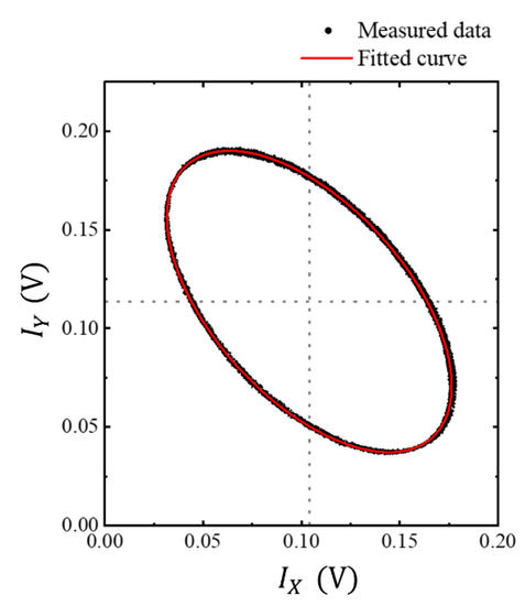 The curve fitting with the ellipse was carried out using the OriginPro (OriginLab. Inc., Northampton, MA, USA), which was a program based on an orthogonal distance regression algorithm. With the obtained fitting coefficients, B to F, of Equation (5), the measurement parameters of Equations (1)–(4) were calculated and listed in Table 1.