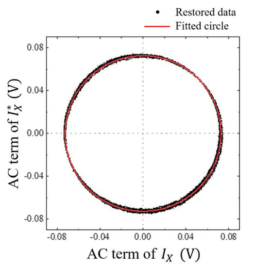 Furthermore, to check the performance of the proposed method, the quadrature signal (), the sine version of the original cosine signal ( in Equation (1), was constructed by using the parameters of Table 1 and the phase calculated with Equations (16) or (17). With the reconstructed conjugate signal pair, the Lissajous curve was replotted. As shown in Figure 5, it was fitted well with a circle, giving a R2 value of 0.9999, which confirmed that the entire complex interference signal was restored successfully with the proposed curve fitting method.