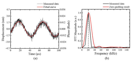 After obtaining the parameters of the system with the premeasurement and the proposed ellipse curve fitting method as shown in Table 1, the main small displacement measurement was performed. Figure 3 shows the experimental setup, wherein a 20 kHz sinusoidal motion was induced in the PZT of the sample arm using a function generator, while the reference arm was fixed. A small alternating voltage of 500 mVpp was applied to the PZT. Thereafter, the entire complex interference signal was reconstructed using the fitting parameters listed in Table 1, and the PZT-induced displacement was calculated by using Equations (17) and (18). As shown in Figure 6a, the amplitude of the measured phase variation was about 0.012 radians, corresponding to 0.69 in the phase angle, from which the maximum displacement of the sinusoidal vibration was calculated to be around 1.5 nm. The STDEV between the measured data and the fitted sinusoidal red curve was 0.4 nm. In this experiment, any filter for decreasing the noise was not applied. In addition, a frequency analysis was performed by taking the FFT to confirm whether the displacement signal was identical to the motion induced by the function generator. Figure 6b shows the frequency spectrum of the measured displacement, which had a dominant peak at 20 kHz. However, when the zero-padding was performed to monitor the frequency component more smoothly, the peak frequency was slightly blue-shifted. We infer that this shift was probably due to the zero-padding and the associated signal filtering process. Further analysis is necessary.