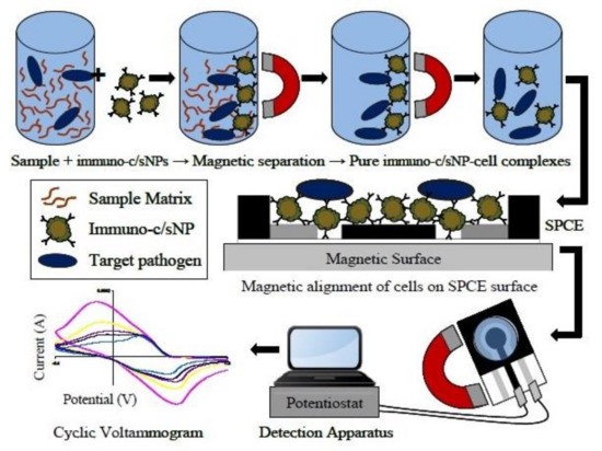 Immunomagnetic separation from sample matrix, magnetic alignment on SPCE surface and electrochemical detection of B. cereus cells (from [65]).