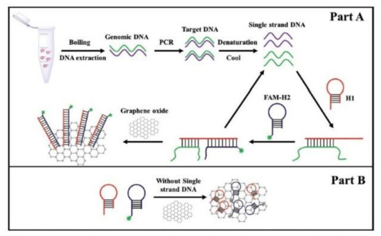 The principle of catalytic hairpin assembly-graphene oxide assay to detect emetic B. cereus in the presence of the target ssDNA (A) and in the negative control (B), (Adapted with permission from [88]).