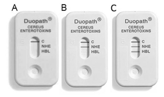 Example of Duopath® lateral flow kit that detected the absence of enterotoxin (A), the presence of Nhe (B) and the presence of both Nhe and Hbl enterotoxins (C).