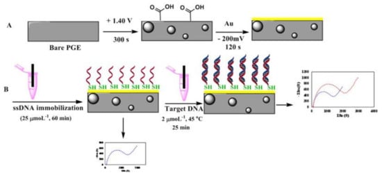Schematic presentation of the immobilization of the ssDNA on a pencil graphite electrode modified with nano-gold (A) and its hybridization with B. cereus genomic DNA (B) (Reprinted with Permission from [60]).