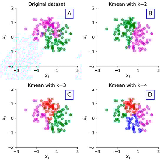 where = 1 for the observation belonging to the cluster ; otherwise, = 0. Meanwhile, is the centroid of the cluster , which consists of the observation . Figure 1 shows an example of the k-means clustering algorithm that utilizes Euclidean distance on an example dataset with various k values.