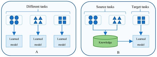 The comparison between (A) traditional machine learning and (B) transfer learning.